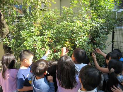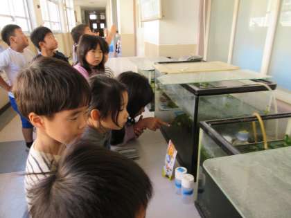 おうちの人に知らせる文章を書きます。学校にあるもので知らせたいものは何か、さがしに行きました。かわいいウサギさんや、おもしろい木、理科室の前のメダカ、大きな切り株、池の金魚など。いろんなものを見付けて、何を書きたいか決めることができました。