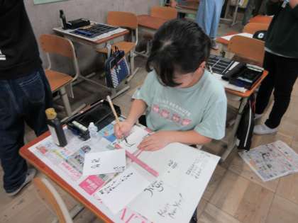 書道クラブでは、年賀状のデザインを考える活動をしました。文字や絵など、いろいろ工夫ができる年賀状。たのしく考えました。