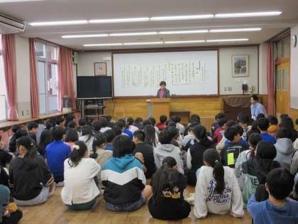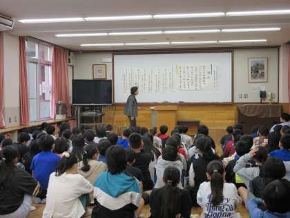 「ようこそアーティスト」の学習で、短歌の先生が来校しました。はじめは、有名な人の短歌について話を聞きました。そして、あらかじめ提出した子どもたちの短歌から、優秀作品が発表され、盛り上がりました。