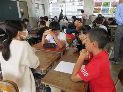 次に、教室での活動をしました。グループで話し合い、テーマを基にして短歌をつくりました。グループでじっくり話し合いました。「1時間ほしい」「短歌おもしろい」などのつぶやきが聞こえてきました。