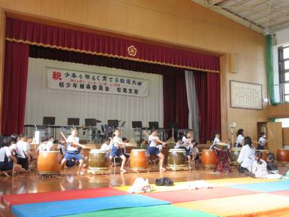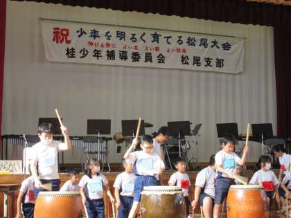 地域主催の「少年を明るく育てる松尾大会」に、本校の和太鼓部とMMCが出演しました。他に、地域の「もこもこ」さんや、中学校の吹奏楽部も参加しました。