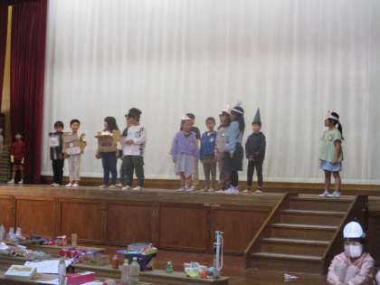 劇で身につけていたものや、いろいろな音を表現する楽器は、子どもたちが自分で考えて手作りで作りました。