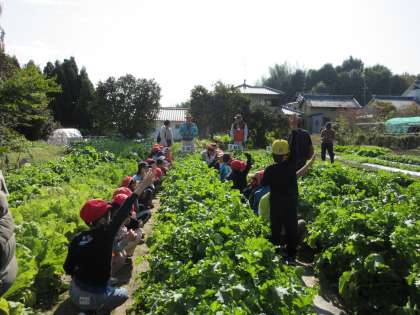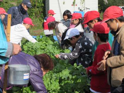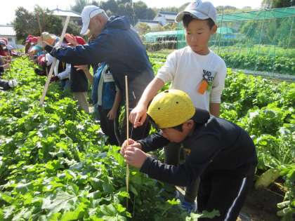 測定をしたあとは、記録を言いたい!とたくさん手があがりました。次は、肥料をあげます。有機肥料をあげました。「あぶらかす」というものでした。化学肥料と有機肥料の違いについて教えてもらいました。大根の部分にかからないよう、注意してあげました。