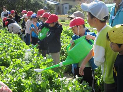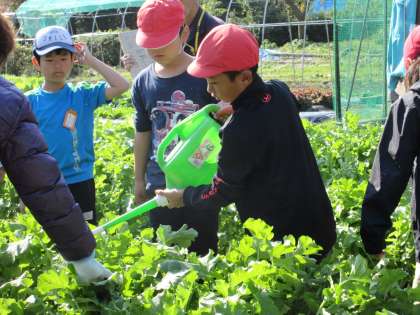 肥料をあげるのも、水をあげるのも、友だちと協力しながら。あぶらかすをまいたところに、水をあげました。