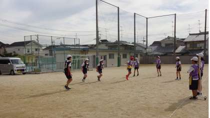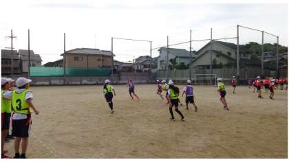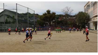 体育の時間にタグラグビーの学習を始めました。みんなで楽しくゲームをしています。