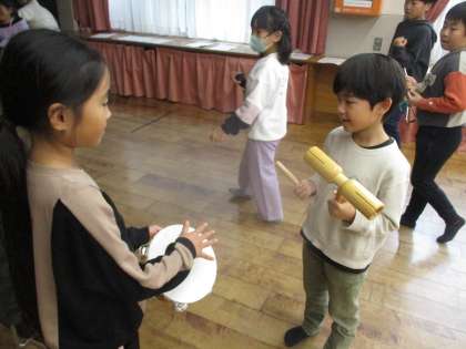 音楽の時間では、打楽器をはくに合わせて叩く学習をしました。今日は打楽器で友だちとリズムの叩き合いっこをしました。楽器でお話しているみたい!と、子どもたちは楽しく学習することができました。