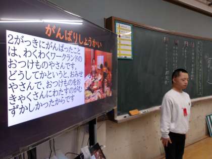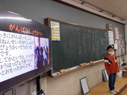 交流会では、『がんばりしょうかい』と題して、お互いに2学期に頑張ったことを紹介し合います。今日は、絵日記アプリを使って、2学期に頑張ったことをまとめ、実際にみんなの前で発表する練習をしました。