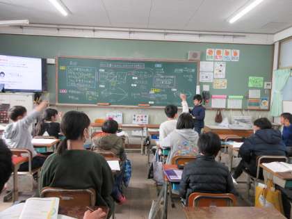 すすんで黒板に図をかいて、説明する様子が見られました。子どもたちは一生懸命考えていました。
