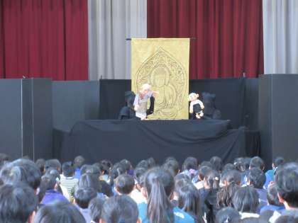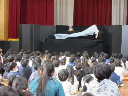 地域の方による、本格的な人形劇。子どもたちは、45分の人形劇を、ずっと集中して夢中で鑑賞しました。