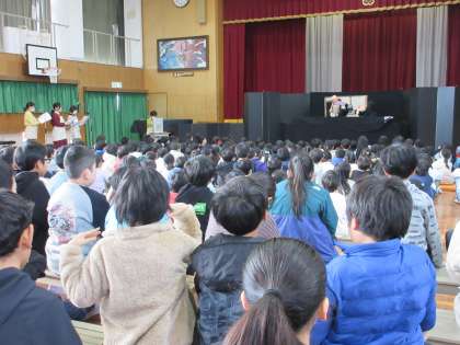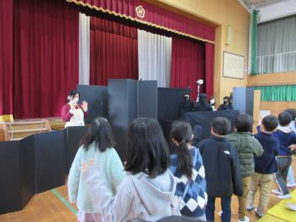 おわったあとは、子どもたちは舞台に近づき、興味津々でのぞいていました。もこもこさんの方々と「ばいばい」をしました。