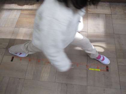 今日は、教室の中で1mぐらいのものを探してみました。1mものさしに両手を合わせて1mをつくったり、1mの長さのテープを作って調べたりしました。また、足で1mがどれぐらいかも調べてみました。子どもたちは、目いっぱい広げた1歩が1mぐらいなのだということを知ることができました。