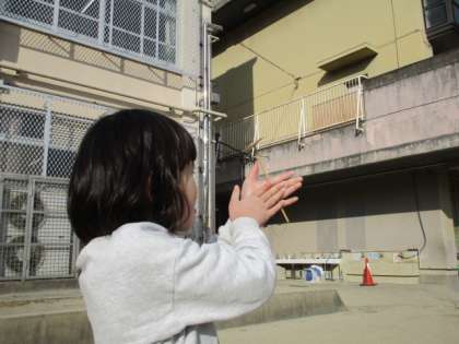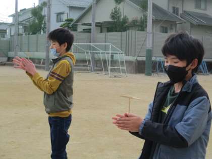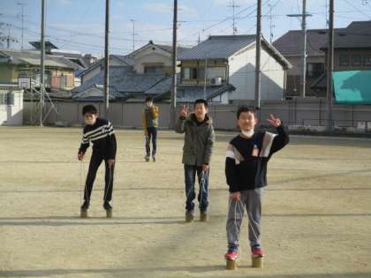 運動場で竹ぽっくり、はねつき、竹とんぼをしました。