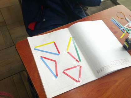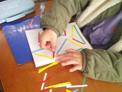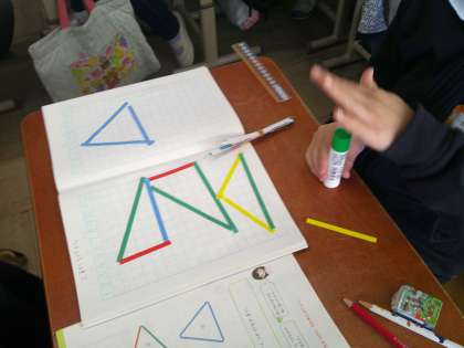算数の学習で,いろいろな辺の長さを組合せ,三角形を作りました。