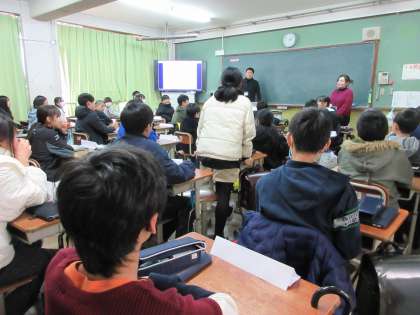 松尾中学校のオープンスクールへ行きました。英語の学習では、3ヒントのクイズに答えたり、タブレット端末を使って、3ヒントクイズをつくったりしました。