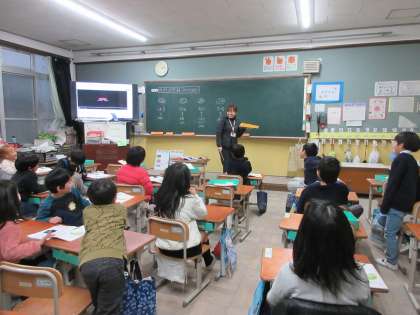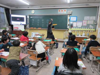 夜空の様子を思いうかべるために、鉄筋を教室に持ってきました。先生が箱から取り出すと、興味津々の子どもたちでしたが、先生が音を鳴らすと、もっと興味津々。身を乗り出して、見つめる子どもがどんどんでてきました。