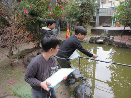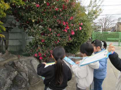 などの工夫も確かめました。「書けそう」「書いてみたい」という気持ちになってから、教室の外へ出て、詩を書いてみました。