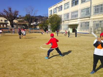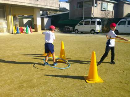 フラフープや一輪車,大縄跳びなどの用具を使った遊びをそれぞれ考えました。