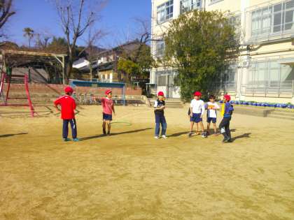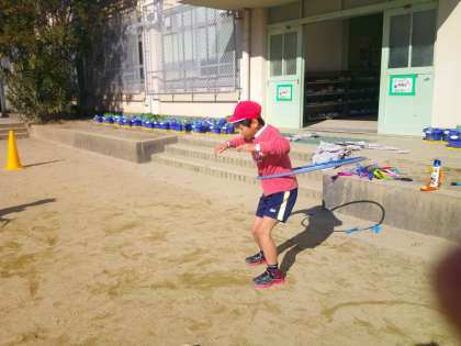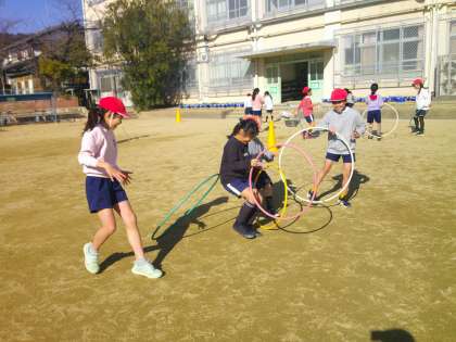 3人でなわとびをしたり、フラフープを「せーの」で転がしてみたり,,,