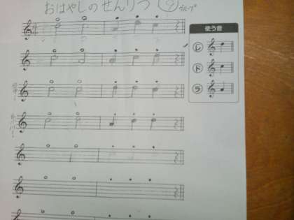 ラ,ド,レの音符を楽譜に書く練習をしました。