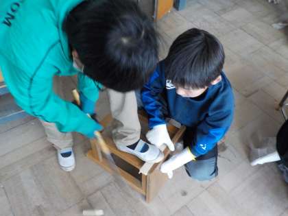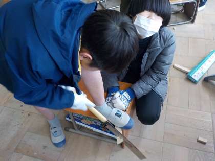 のこぎりを使って、自分の切りたい形に木材を切りました。斜めに切ってみたり、少し小さく切ってみたりと、色々な切り方を試していました。
