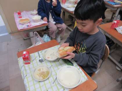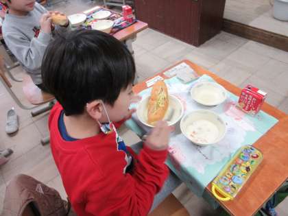 今日の給食は、コッペパン、ツナサンドの具、チャウダーでした。自分でパンに切り込みを入れて、ツナサンドの具を入れました。みんな、とても上手にツナサンドを作りました。「おいしい」と言って、たくさん食べました。