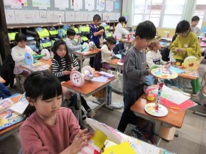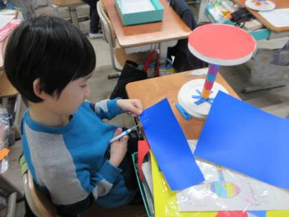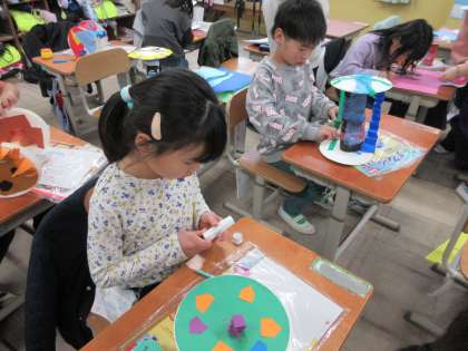 転がる仕組みを使って、おもちゃを作りました。動きを確かめながら、色画用紙やひもなどで飾りをつけました。ハサミの使い方に注意して作りました。「先生、見て見て!」といろんなところから声が聞こえてきました。イメージ通り、作りたいとおりにつくることができたようです。