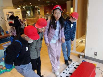 着いたら、まずはみんなで館内の見学へ!大型科学おもちゃを楽しんだり、ドクターフィッシュに触れたり、恐竜やアジアゾウの骨格標本を見たりしました。