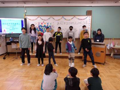 交流会の最後にはお互いに音楽科の学習で取り組んできた歌を送り合いました。6くみは「明日という日が」を、あおぞら学級は「野に咲く花のように」を送りました。