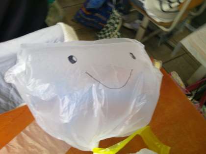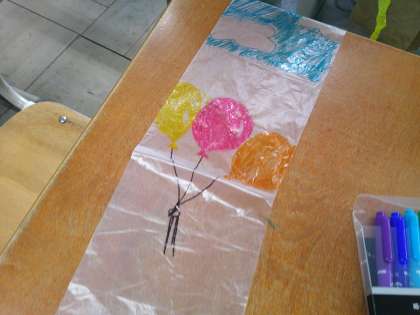袋に絵をかいて,送風機の風で浮かばせました。