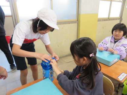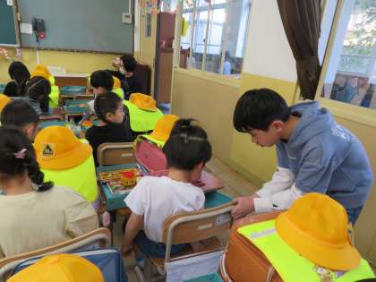 6年生として、1年生の朝の準備のお手伝いを行っています。やさしく声かけをし教えています。頼もしいリーダーになること間違いなしです。