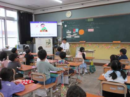 今日は、いよいよ初めての給食。給食を食べるときに大事なことを確かめました。「ゆっくり食べること」「口の中に一度にたくさん入れないこと」「パンは一口ずつ小さく切って食べること」「食べ物を口に入れたまましゃべらない」など、おいしく安全に食べる大事なことを確かめました。子どもたちは、とても真剣に聞いていました。