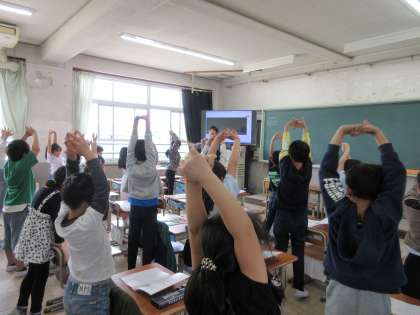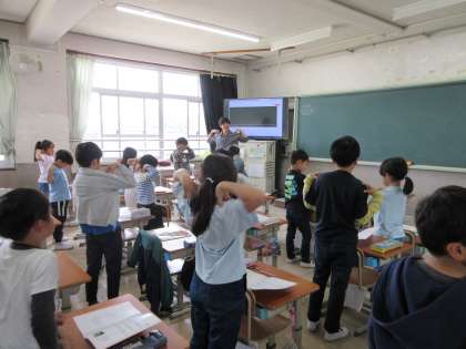 体をリラックスさせてから、国歌や校歌を歌いました。とてもきれいな歌声が学校に響きました。運動場で体育している子どもたちが「校歌や」「うまいな」など、話していました。