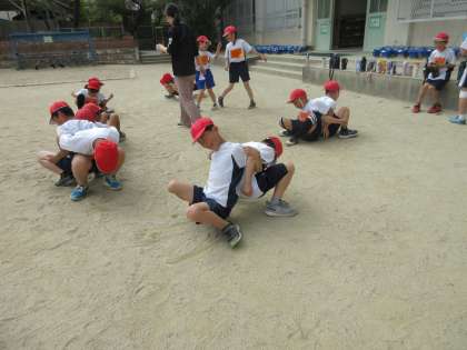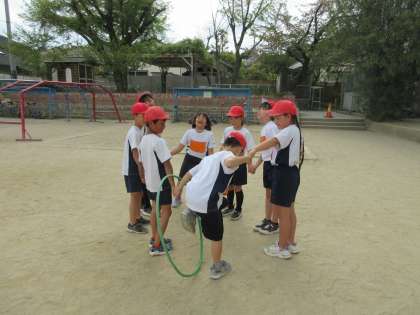 友達と息を合わせて「せーの」と言って立ちます。手をつないで輪をまわす・・・。色んな運動を友だちやグループで楽しみました。子どもたちは笑顔いっぱいでした。新しいクラスの仲間とつながっていく運動をたくさんしました。