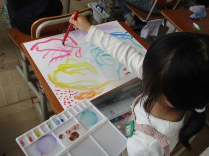 今日は図工の時間に、絵の具の学習をしました。絵の具の使い方の確認をして、その後は思い思いに筆を動かし、画用紙いっぱいに線や点を描きました。3年生初めての図工でしたが、とても楽しそうに学習していました。
