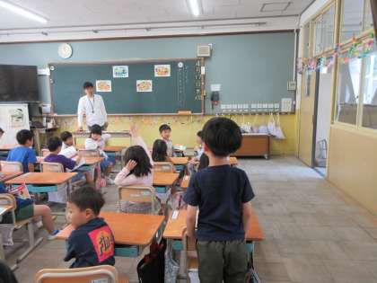 「たのしいがっこう」について、絵を基に考えました。どんなふうに頑張りたいか聞いてみると「友だちとなかよくしたい」「みんなとがんばりたい」という意見がでてきました。