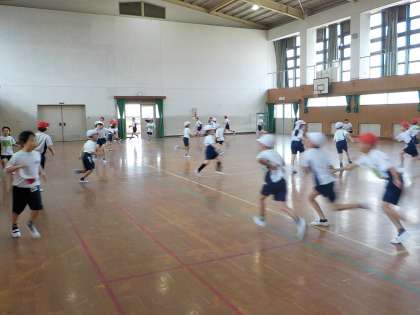 体育館でおにごっこやボール送りなどをしました。