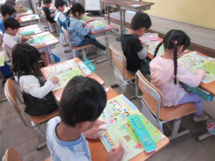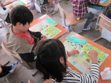 今日は、数図ブロックを使って数を調べました。数図ブロックの青い面とオレンジの面を使って、どちらが多いか調べました。