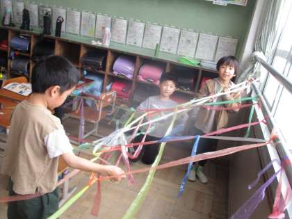 図工の時間に、『ひもでつないで』の学習をしました。方結びや蝶結びの結び方を知った後、教室中にひもを張り巡らせて楽しみました。
