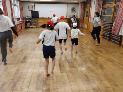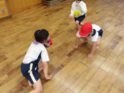 かえる跳びやスキップなど先生の見せる色々な動きをよく見て、みんなで楽しく取り組みました。