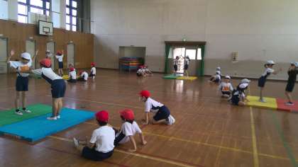 低い姿勢になって、かわしたり、押したり、すもうあそびの学習を進めています。