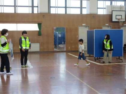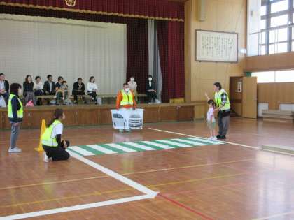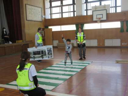 お話の後は実際に道路を渡る活動をしました。自動車が行き交う中で、安全確認をしながら歩きました。