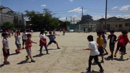 遊び係が企画して「アメリカンドッジ」を行いました。天気も良く、みんなで楽しく体を動かしました。