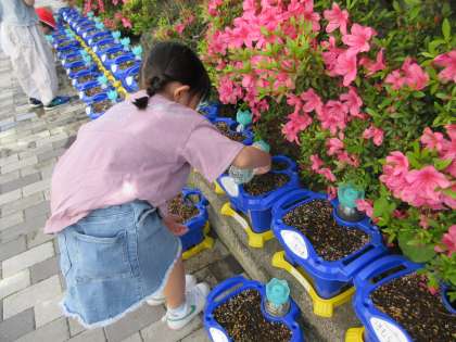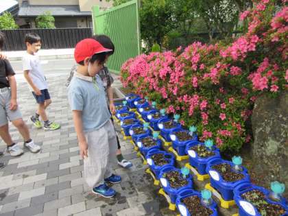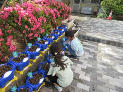 アサガオに毎日お水をあげています。芽が出てきたアサガオもあります。
