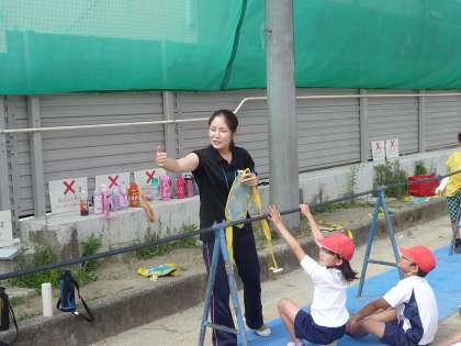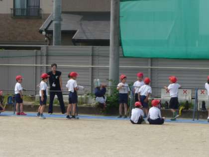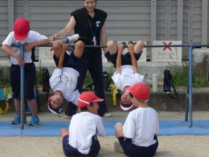 この日は,新たに逆上がりの補助具について,担任の先生から子どもたちに説明がありました。