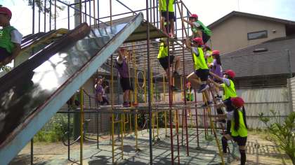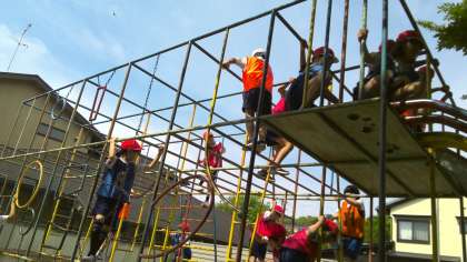 安全に総合遊具で遊ぶための学習を改めて行いました。                                   遊具の握り方から再度学習をし、総合遊具では追いかけっこや友達を引っ張ったりしない、滑り台の安全な滑り方など、ていねいに総合遊具の使い方を学びました。