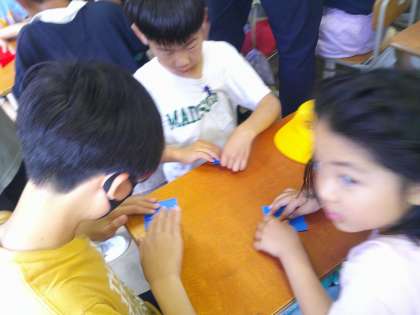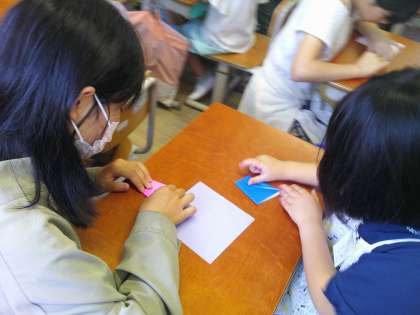 6年生の修学旅行に持っていく千羽鶴の作り方を教えてもらいました。