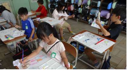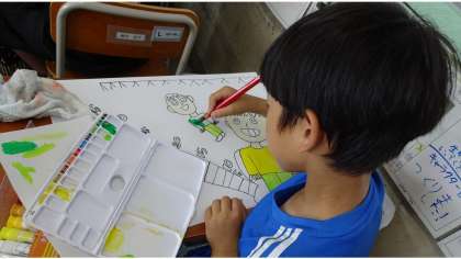 図画工作の時間に、絵をかいています。色のぬり方に気を付けて、集中して取り組んでいます。