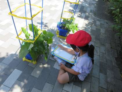 アサガオが大きくなってきました。もっと大きくなってほしい、と思い、支柱を立てました。そして、大きくなった葉の大きさや形、手触り、アサガオの気持ちやアサガオの言葉をよく見て、よく聞いて、耳を澄ませて、記録しました。