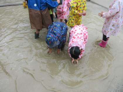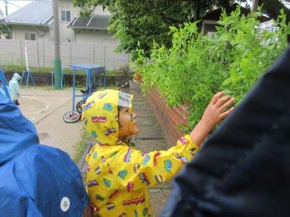 朝の大雨が子どもたちにとってラッキーな天気に。雨の日、雨上がりでしか見つけられないものを見つけにたんけんです。