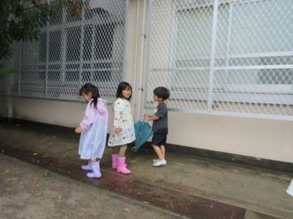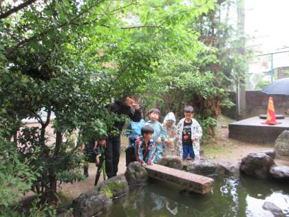 傘にどろがついたり、長靴や靴の中まで濡れてしまったり、大発見に夢中の子どもたちが、泥んこにしてしまいました。保護者の皆様、申し訳ございませんでした。レインコートなどたくさんの準備にご協力くださり、本当にありがとうございました。